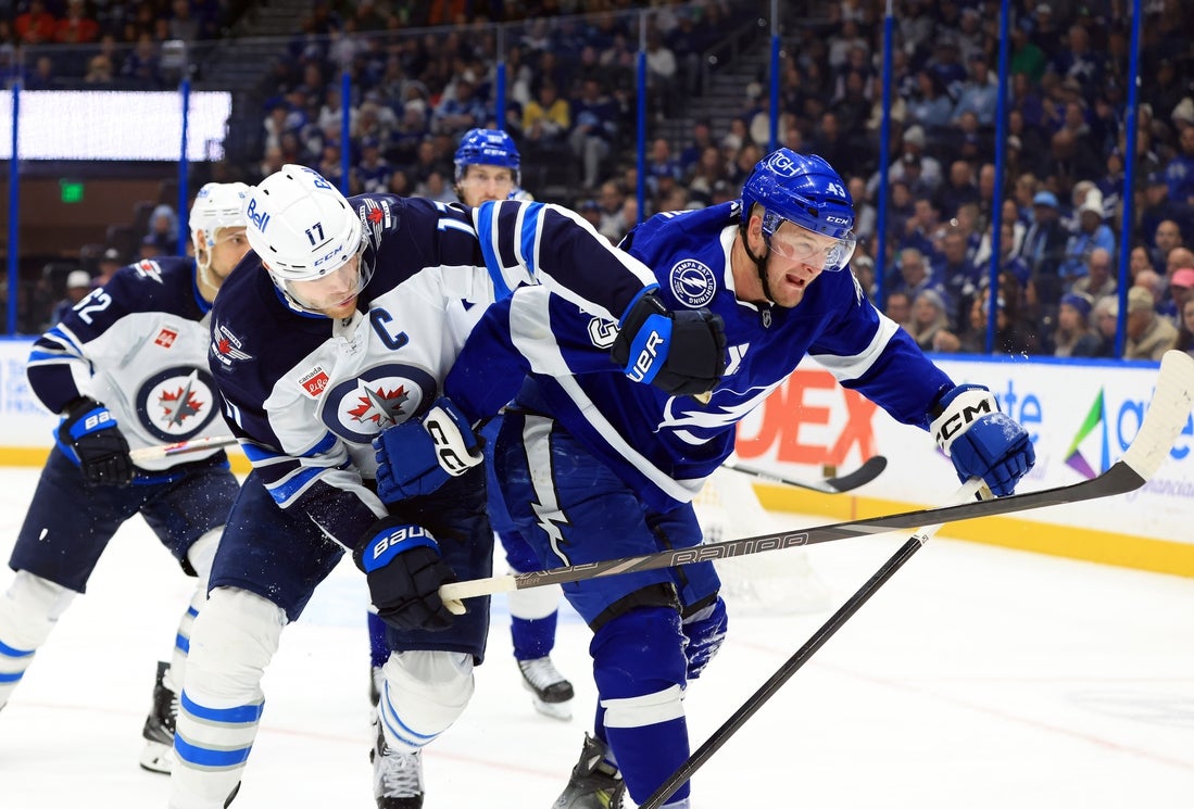 NHL: Winnipeg Jets at Tampa Bay LightningJan 29, 2026; Tampa, Florida, USA; Winnipeg Jets center Adam Lowry (17) and Tampa Bay Lightning defenseman Darren Raddysh (43) skate towards the puck during the second period at Benchmark International Arena. Mandatory Credit: Kim Klement Neitzel-Imagn Images