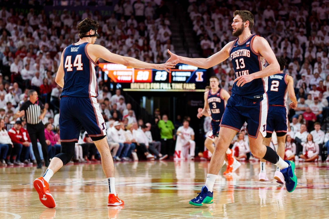 Feb 1, 2026; Lincoln, Nebraska, USA; Illinois Fighting Illini center Tomislav Ivisic (13) and center Zvonimir Ivisic (44) celebrate after a shot in the first half against the Nebraska Cornhuskers at Pinnacle Bank Arena. Mandatory Credit: Dylan Widger-Imagn Images Keaton Wagler scored 23 of his game-high 28 points in the second half as No. 9 Illinois rallied for a 78-69 Big Ten victory over No. 5 Nebraska on Sunday afternoon in Lincoln, Neb.