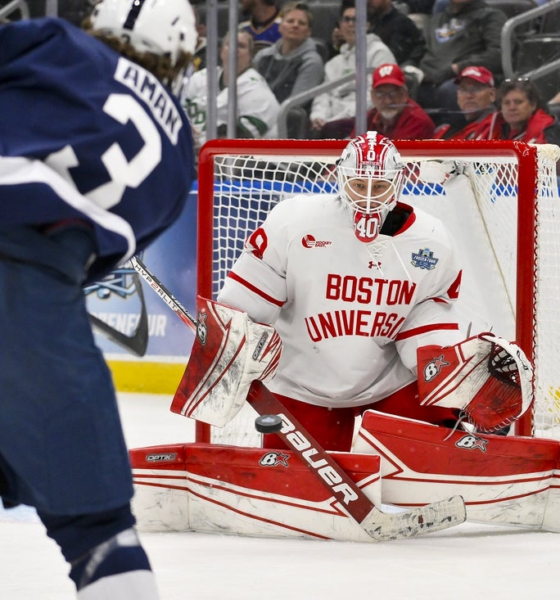 Oct 26, 2024; Boston, Massachusetts, USA; Boston Bruins left wing Cole Koepke (45) tries to stuff the puck past Toronto Maple Leafs goaltender Anthony Stolarz (41)...