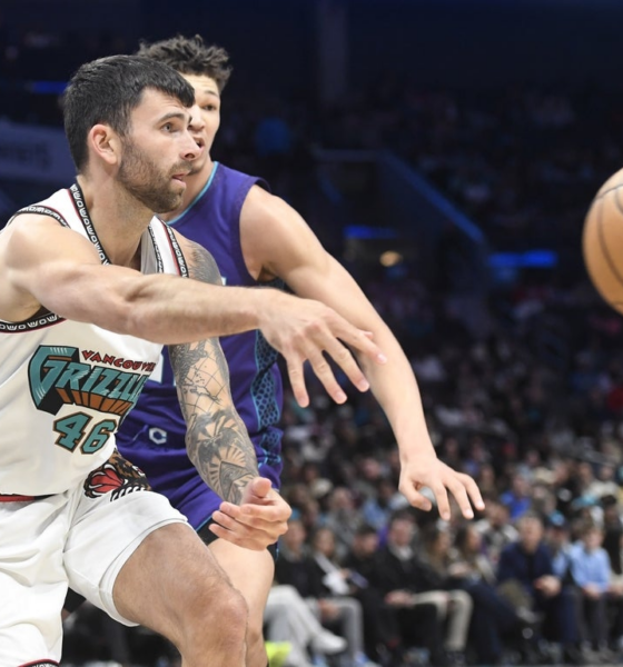 Apr 14, 2023; Vancouver, British Columbia, CAN; Belgium Team Captain Wim Fissette chats with Ysaline Bonaventure in her singles match with Rebecca Marino of Canada during...