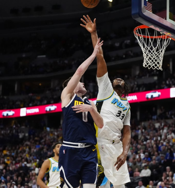 Jan 7, 2024; Paradise, Nevada, USA; Denver Broncos quarterback Jarrett Stidham (4) reacts after being knocked down by Las Vegas Raiders defensive end Malcolm Koonce (51)...