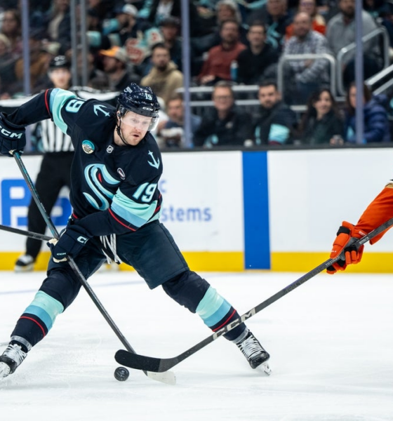 Dec 19, 2022; Las Vegas, Nevada, USA; Buffalo Sabres center Peyton Krebs (19) warms up before a game against the Vegas Golden Knights at T-Mobile Arena....