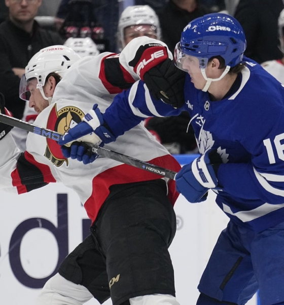 Mar 20, 2023; Pittsburgh, Pennsylvania, USA; Ottawa Senators goaltender Dylan Ferguson (34) takes a drink during a time-out against the Pittsburgh Penguins in the third period...