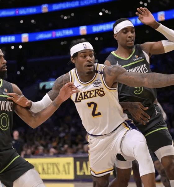Jan 2, 2025; Los Angeles, California, USA; Los Angeles Lakers forward LeBron James (23) heads down court after a 3-point basket in the first half against...