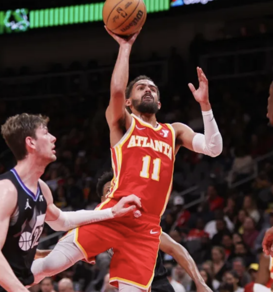 Atlanta Hawks guard Trae Young (11) celebrates his three-point basket in the fourth quarter against the Cleveland Cavaliers at Rocket Mortgage FieldHouse. Mandatory Credit: David Richard-Imagn...
