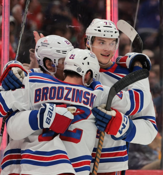 Nov 27, 2024; Newark, New Jersey, USA; St. Louis Blues goaltender Jordan Binnington (50) makes a save against the New Jersey Devils during the second period...