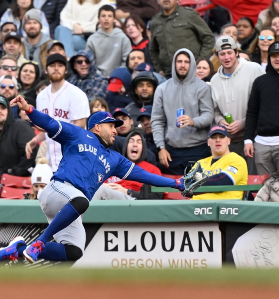 Oct 30, 2024; Denver, Colorado, USA; Colorado Avalanche center Matt Stienburg (36) is escorted off the ice by linesman Brandon Gawryletz (64) after receiving a game...