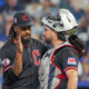 Jul 26, 2025; Kansas City, Missouri, USA; Cleveland Guardians relief pitcher Emmanuel Clase (48) celebrates with catcher Austin Hedges (27) after the win over the Kansas City Royals at Kauffman Stadium. Mandatory Credit: Denny Medley-Imagn Images Thanks to a document filed by an attorney representing Cleveland Guardians pitcher Luis Ortiz, there’s new suspicion that Guardians closer Emmanuel Clase participated in pitch-fixing far more frequently than previously believed.