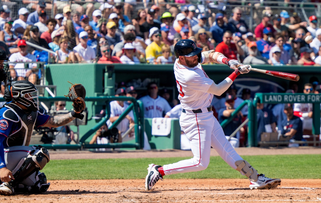 Mar 2, 2025; Fort Myers, Florida, USA; Boston Red Sox Trevor Story (10) doubles in the third inning on a fly ball to left field at JetBlue Park at Fenway South against the New York Mets. Mandatory Credit: Chris Tilley-Imagn Images Trevor Story hit two of Boston’s six homers and the Red Sox cruised to 20-5 win over the Miami Marlins on Thursday in a spring training game at Fort Myers, Fla.