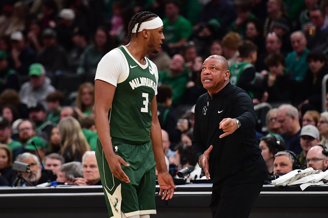 Feb 1, 2026; Boston, Massachusetts, USA; Milwaukee Bucks head coach Doc Rivers has words with center Myles Turner (3) during the second half against the Boston Celtics at TD Garden. Mandatory Credit: Bob DeChiara-Imagn Images Riding a five-game losing streak after an unsuccessful road trip, the Milwaukee Bucks start a three-game homestand where fans in Milwaukee are likely more focused on what might happen off the court than on it.