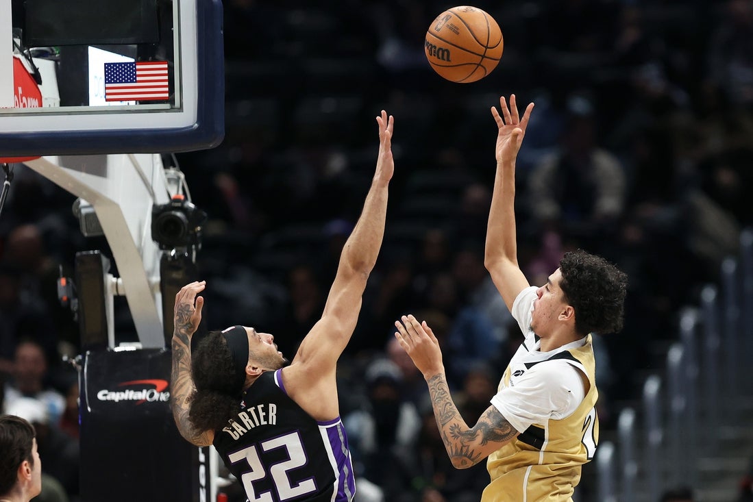 Feb 1, 2026; Washington, District of Columbia, USA; Washington Wizards guard Will Riley (27) takes a shot over Sacramento Kings guard Devin Carter (22) during the second half at Capital One Arena. Mandatory Credit: Daniel Kucin Jr.-Imagn Images Rookie Will Riley scored a season-high 18 points as the Washington Wizards defeated the visiting Sacramento Kings 116-112 on Sunday.